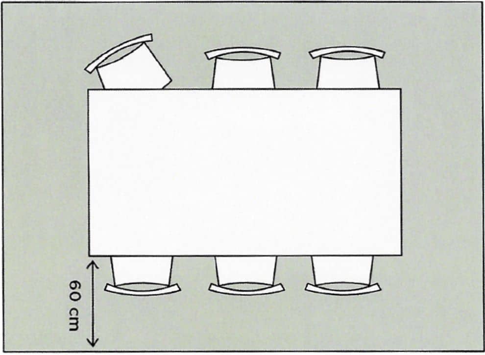 Når du vælger tæppestørrelse til spisegruppen, er det vigtigt at alle møblerne får plads på tæppet og ingen stoleben står udenfor. Ideelt set skal det også gælde når man sidder på stolene. Som hovedregel anbefaler vi derfor, at tæppet skal dække 60 cm på de sider, hvor du har stole placeret.